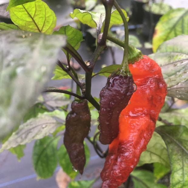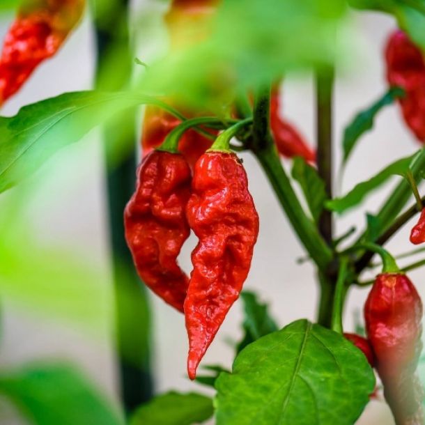 De Trinidad Scorpion Red krijgt soms een kleine stekel, vandaar de naam. Het is een extreem hete peper, die oorspronkelijk uit Trinidad komt. De pepers verkleuren tijdens de rijping van groen naar oranje en worden uiteindelijk rood.